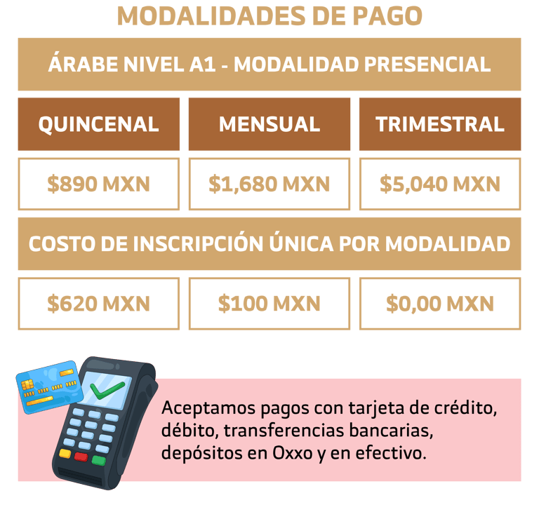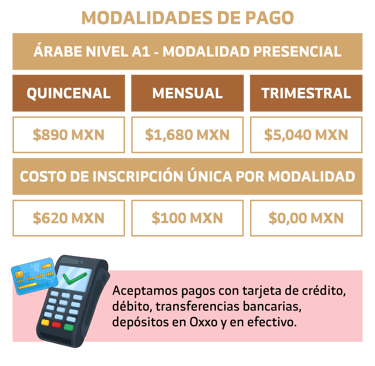 Para inscribirte al curso de Árabe Nivel A1 en modalidad presencial del Ciclo Escolar Invierno 2025-2026, deberás cubrir la primera mensualidad junto con el pago único de inscripción por periodo de $620 MXN; si lo prefieres, puedes liquidar el curso completo con descuento por $5,040 MXN. Una vez realizado el pago, envía tu comprobante por WhatsApp a la Oficina de Inscripciones para finalizar tu registro y asegurar tu lugar.