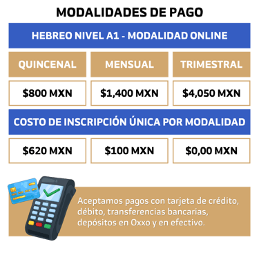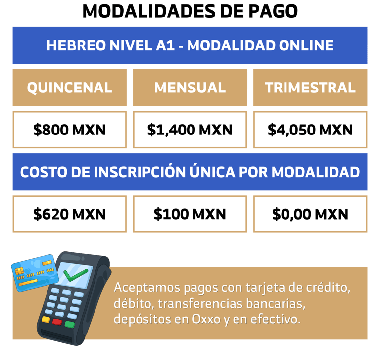 Para inscribirte al curso de Hebreo Nivel A1 en modalidad online del Ciclo Escolar Verano 2026, deberás cubrir la primera mensualidad junto con el pago único de inscripción por periodo de $620 MXN; si lo prefieres, puedes liquidar el curso completo con descuento por $4,050 MXN. Una vez realizado el pago, envía tu comprobante por WhatsApp a la Oficina de Inscripciones para finalizar tu registro y asegurar tu lugar.