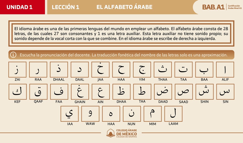 En esta lección conocerás el alfabeto árabe, sus 28 letras, formas básicas y sonidos esenciales, aprendiendo a identificarlas, pronunciarlas correctamente y escribir tus primeras palabras en árabe estándar.