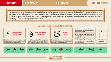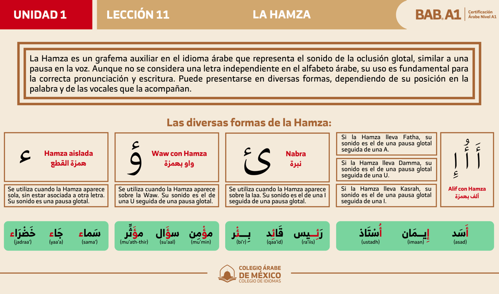 En esta lección conocerás la Hamza como grafema auxiliar que indica la oclusión glotal, aprendiendo sus distintas formas de escritura según su posición y vocalización, para pronunciar y escribir correctamente palabras comunes en árabe.