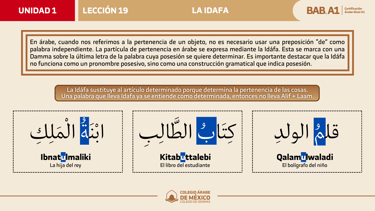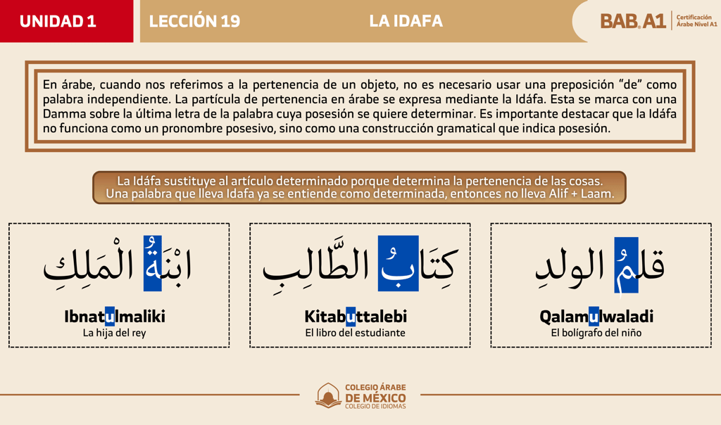 En esta lección estudiarás la construcción de la Idáfa en árabe, comprendiendo cómo se expresa la pertenencia sin preposición, su estructura gramatical, el uso de la Damma final y la ausencia del artículo determinado.