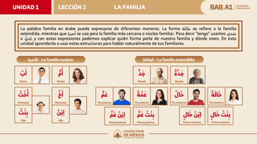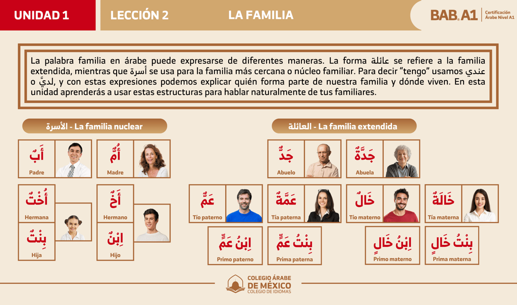 En esta lección aprenderás a identificar y nombrar a los miembros de la familia nuclear y extendida en árabe, usando estructuras claras para describir tus vínculos familiares, hablar de tus parientes y entender relaciones genealógicas.