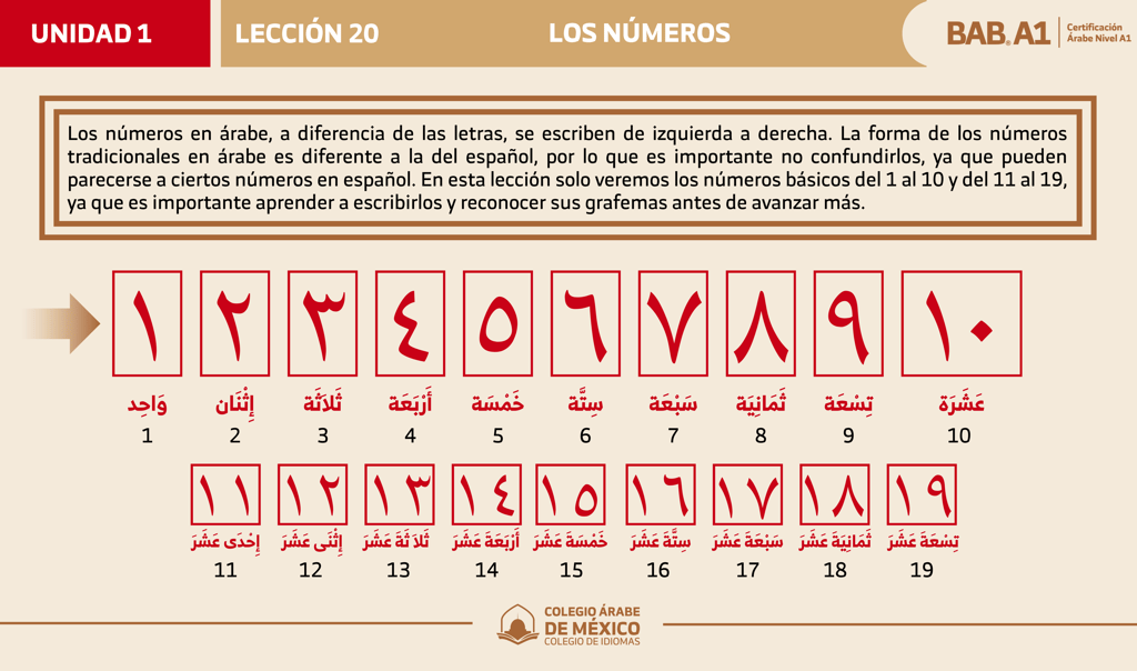 En esta lección aprenderás los números básicos en árabe del 1 al 10 y del 11 al 19, reconociendo sus grafías, pronunciación y dirección de escritura para diferenciarlos correctamente de los números utilizados en español.