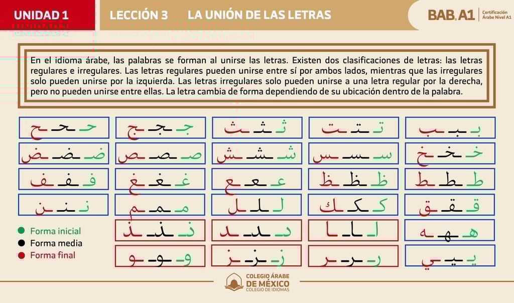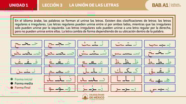 En esta lección aprenderás cómo se unen las letras árabes entre sí, diferenciando las formas regulares e irregulares, y practicando la escritura conectada para formar tus primeras sílabas y palabras completas.