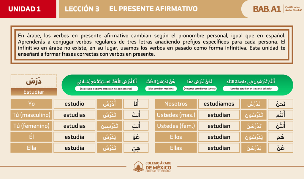 En esta lección aprenderás a conjugar los verbos regulares de tres letras en presente afirmativo, usando los pronombres personales. Descubrirás cómo se forma el presente en árabe mediante prefijos específicos, para que puedas construir oraciones simples y comunicar acciones cotidianas de forma clara.