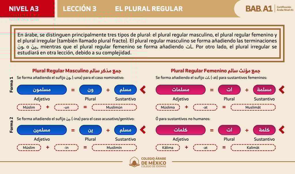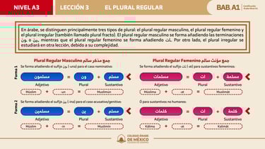 En esta lección aprenderás a formar el plural regular en árabe, diferenciando entre el masculino y el femenino. Practicarás la identificación de sus terminaciones y su uso correcto en palabras y oraciones simples.