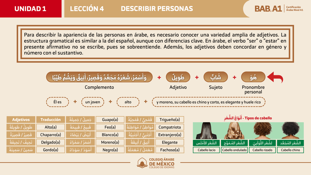 En esta lección aprenderás a describir la apariencia de las personas en árabe, utilizando adjetivos adecuados y estructuras nominales correctas, respetando la concordancia de género y número, y expresando rasgos físicos de forma clara y precisa.