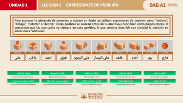En esta lección aprenderás a utilizar preposiciones de lugar en árabe para describir con precisión la ubicación de objetos o personas. Descubrirás expresiones como “debajo de”, “entre”, “detrás” o “afuera”, y aprenderás a aplicarlas correctamente en oraciones simples y cotidianas.