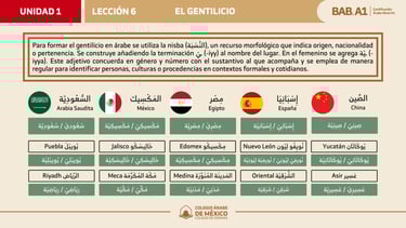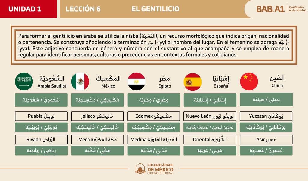 En esta lección aprenderás a identificar y expresar correctamente el gentilicio de las personas, así como el lugar de origen de las cosas en árabe.