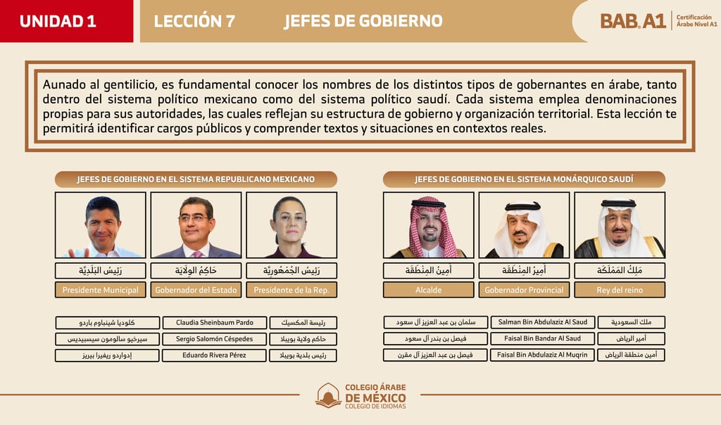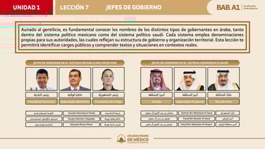 En esta lección aprenderás a identificar los diferentes títulos de los jefes de gobierno/jefes de estado de los países árabes tanto como de México. Reconocerlos es importante para nuestros alumnos que quieran experimentar la vida cotidiana en el mundo árabe.